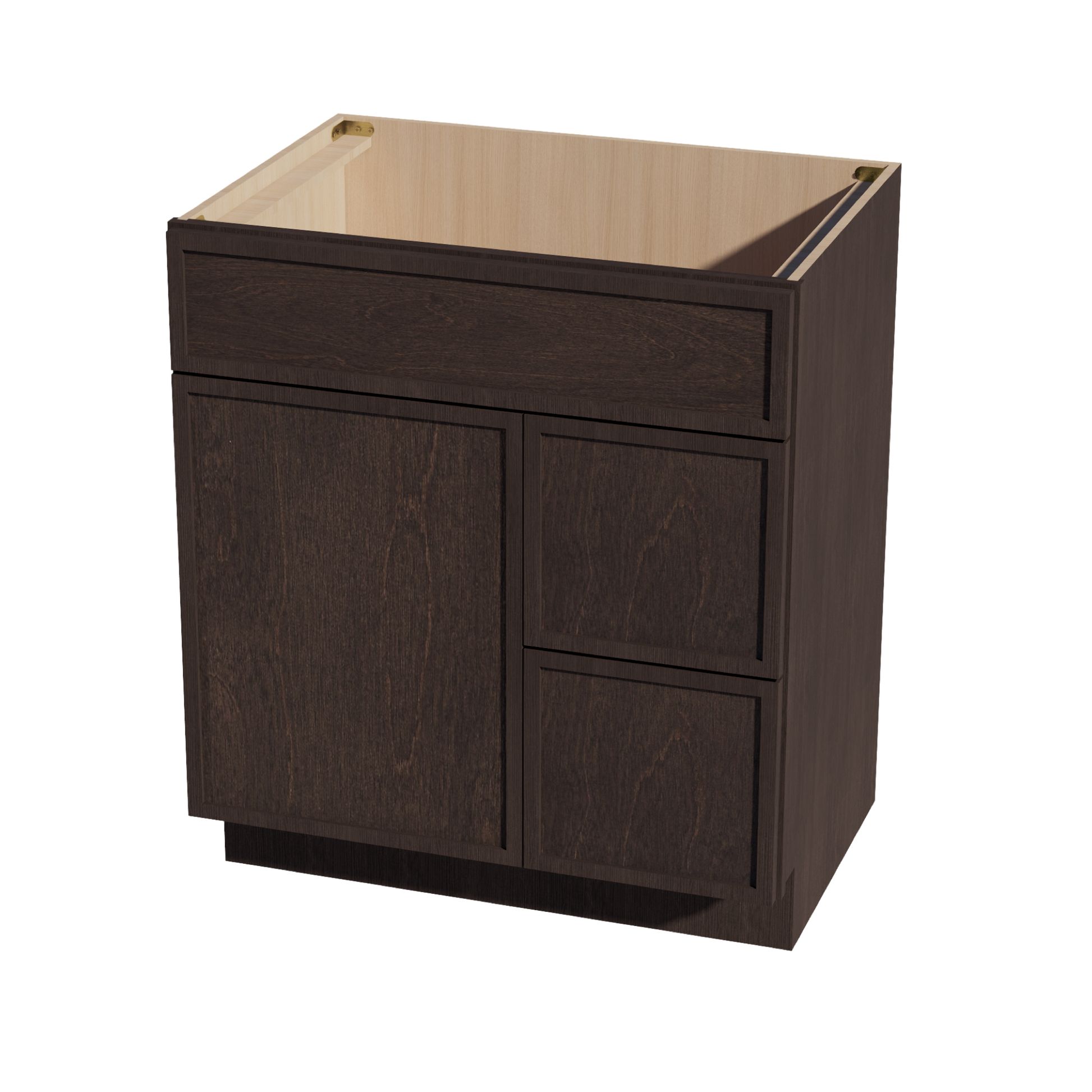SM-VSD3021R: Mocha Brown Slim Shaker 30"W x 34-1/2"H x 21"D 1 Door & 2 Right Drawers Offset Vanity Sink Base Cabinets