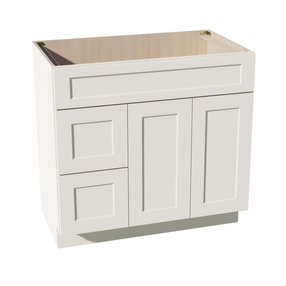 DI-VSD3621L:达拉斯象牙色 Shaker 36 英寸宽 x 34-1/2 英寸高 x 21 英寸深 2 个门和 2 个左抽屉 偏置梳妆台水槽底柜