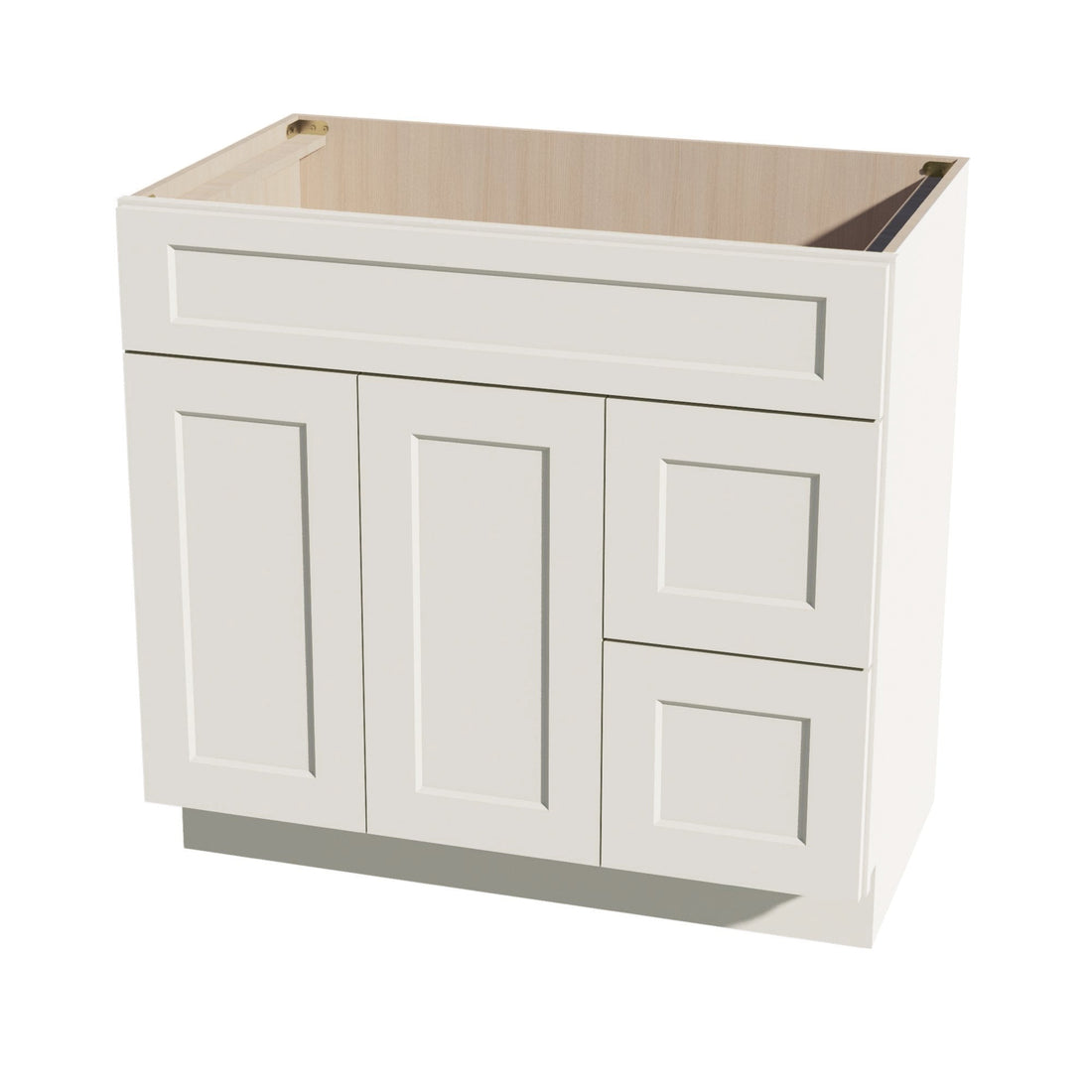 DI-VSD3621R:达拉斯象牙色 Shaker 36 英寸宽 x 34-1/2 英寸高 x 21 英寸深 2 个门和 2 个右侧抽屉 偏置梳妆台水槽底柜