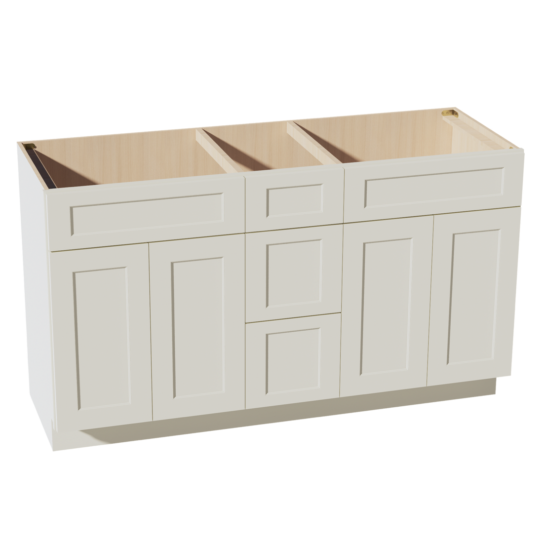 TW-VSD60DOUBLE: Creamy White Shaker 60"W x 34-1/2"H x 21"D 4 Doors, 3 Drawers & 2 False Drawers Double Sink Vanity Base Combo Cabinets